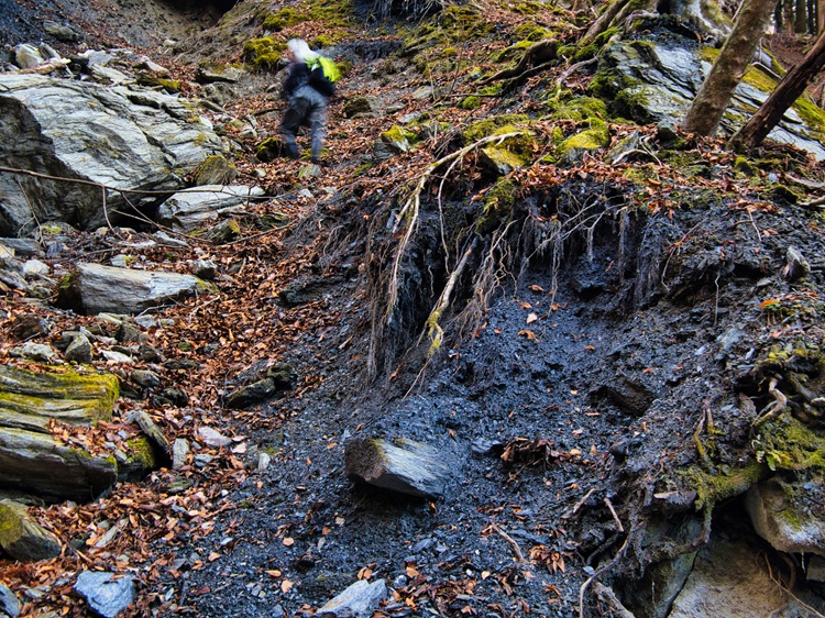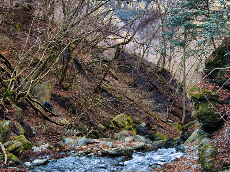 途中から私はペースダウン。体力が持たん・・・。彼らは、まだまだ元気で崖下で釣ってます。下に2人がいます。